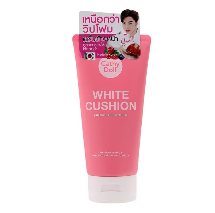 [CATHY DOLL]White Cushion Facial Cleanser es una espuma limpiadora luminadora enriquecida con una mezcla de extractos de bayas y baba de caracol. Ayuda a reducir manchas oscuras y opacidad, brindando un aspecto radiante. Sus finas partículas limpian profundamente, eliminando maquillaje, grasa y polvo, mientras protegen la piel de contaminantes con su beneficio Anti Pollution.