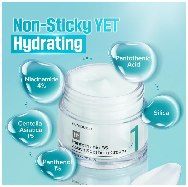 La Numbuzin No.1 Pantothenic B5 Active Soothing Cream es una crema ligera y de rápida absorción diseñada para equilibrar la piel, controlar el exceso de grasa y mantener una hidratación prolongada sin sensación pesada. Ideal para piel mixta o grasa que busca un balance entre hidratación y control del sebo.