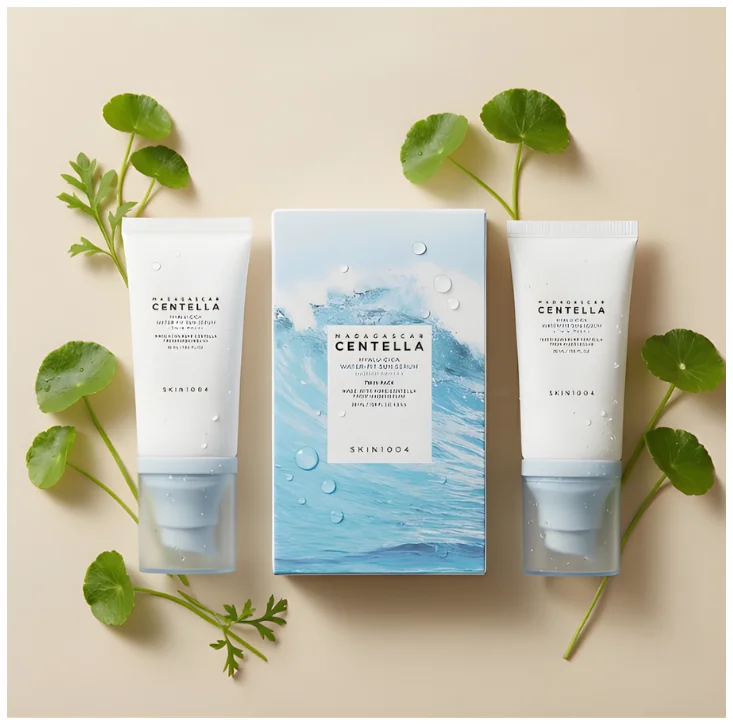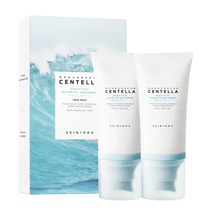 El [SKIN1004] Madagascar Centella Hyalu-Cica Water Fit Sun Serum Twin Pack SPF50+ PA++++ es un protector solar de máxima protección que resguarda la piel eficazmente frente a los rayos UVA y UVB, ayudando a prevenir el daño solar diario.